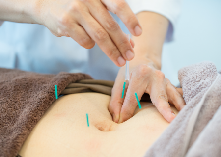 脈やお腹を見ながら細い針で浅く刺して全身の気血の流れを整えます。